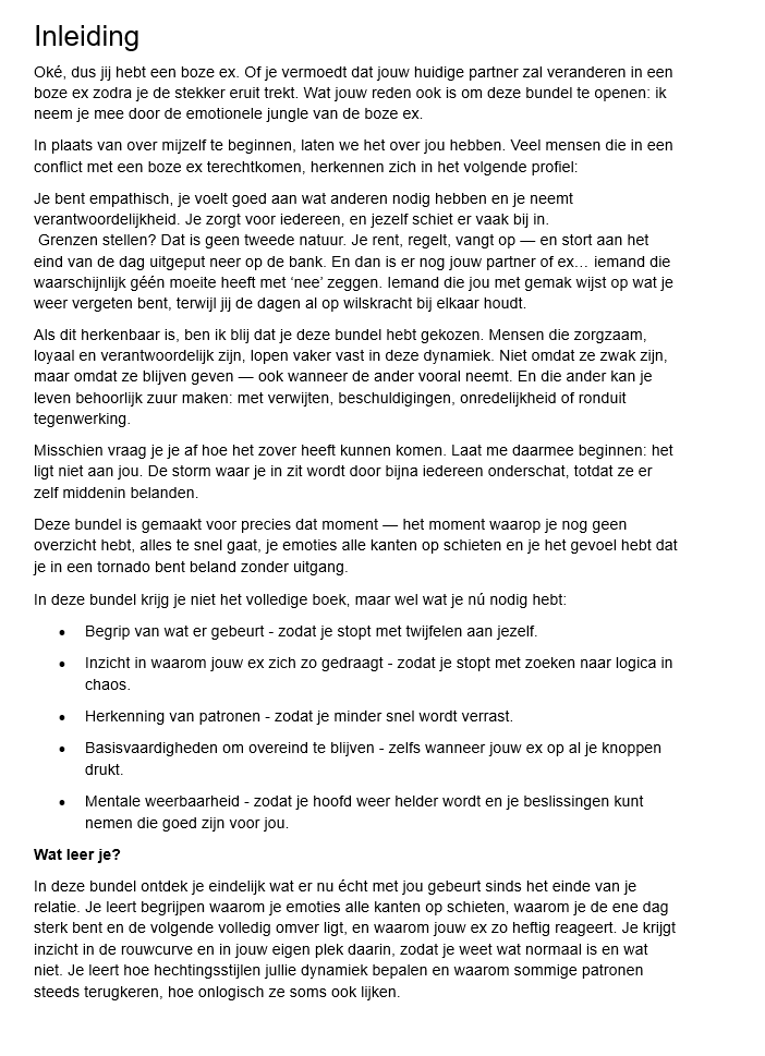 Kort gezegd: na het lezen van deze bundel begrijp je jezelf beter, begrijp je jouw ex beter en zie je voor het eerst een route uit de chaos. Je bent niet gek, je bent niet zwak, en je staat hier niet alleen in. Deze bundel geeft je het inzicht dat je nodig hebt om opnieuw grip te krijgen op je emoties – en op je eigen verhaal.